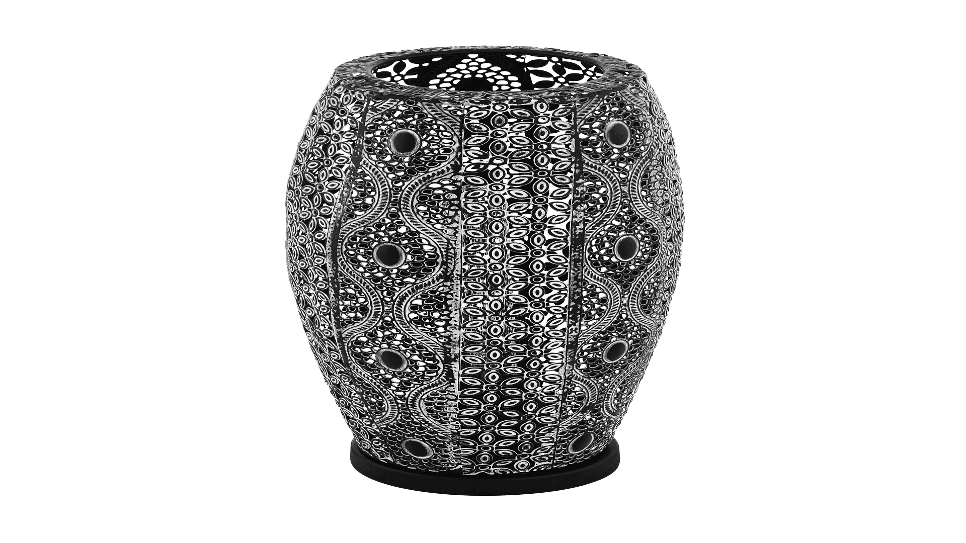 Die Tischleuchte RIYADH ist aus antik-schwarzem Metall mit geschwungenen Motiven und Cut-Outs im Ethno-Muster und einem Lampenfuß aus schwarzem Metall gefertigt. Durch die Cut-Outs entstehen faszinierende Licht- und Schattenspiele, sobald die Leuchte eingeschaltet ist. Die Tischlampe fügt sich nahtlos in die Trends wie Vintage, Orientalisch sowie Boho ein und bringt so den Charme ferner Länder ins eigene Heim. Ebenso ist ein bequemes Ein- und Ausschalten über einen Schalter am Kabel möglich. Sie bietet eine stimmungsvolle Beleuchtung für jeden Raum – egal ob im Schlafzimmer auf dem Nachttisch, im Wohnzimmer, Esszimmer oder im Flur. Das abgebildete Filament-Leuchtmittel ist nicht im Lieferumfang enthalten. Geeignet ist die Leuchte für jedes Leuchtmittel mit E27-Sockel.