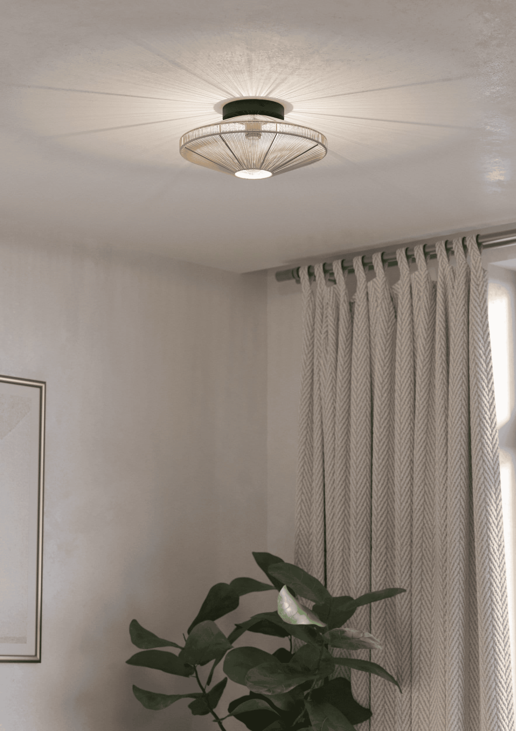 Die Deckenleuchte MIDSUMER besticht durch ihren Schirm aus gewickeltem Hanfgarn, der in einem angenehmen warmen Beige-Farbton gehalten ist. Dieser Farbton erzeugt, in Kombination mit dem passenden Leuchtmittel, ein wunderschön warmes Licht. Die Leuchte präsentiert sich in einer Form im Japandi Stil, die eine harmonische Verbindung von japanischer Ästhetik und skandinavischer Schlichtheit darstellt. Sie fügt sich nahtlos in moderne und minimalistische Einrichtungsstile ein und wird zu einem stilvollen Blickfang an jeder Decke – egal ob im Wohnzimmer, Schlafzimmer, Flur oder Esszimmer. Das abgebildete Leuchtmittel ist nicht im Lieferumfang enthalten. Geeignet ist die Leuchte für jedes Leuchtmittel mit E27-Sockel.