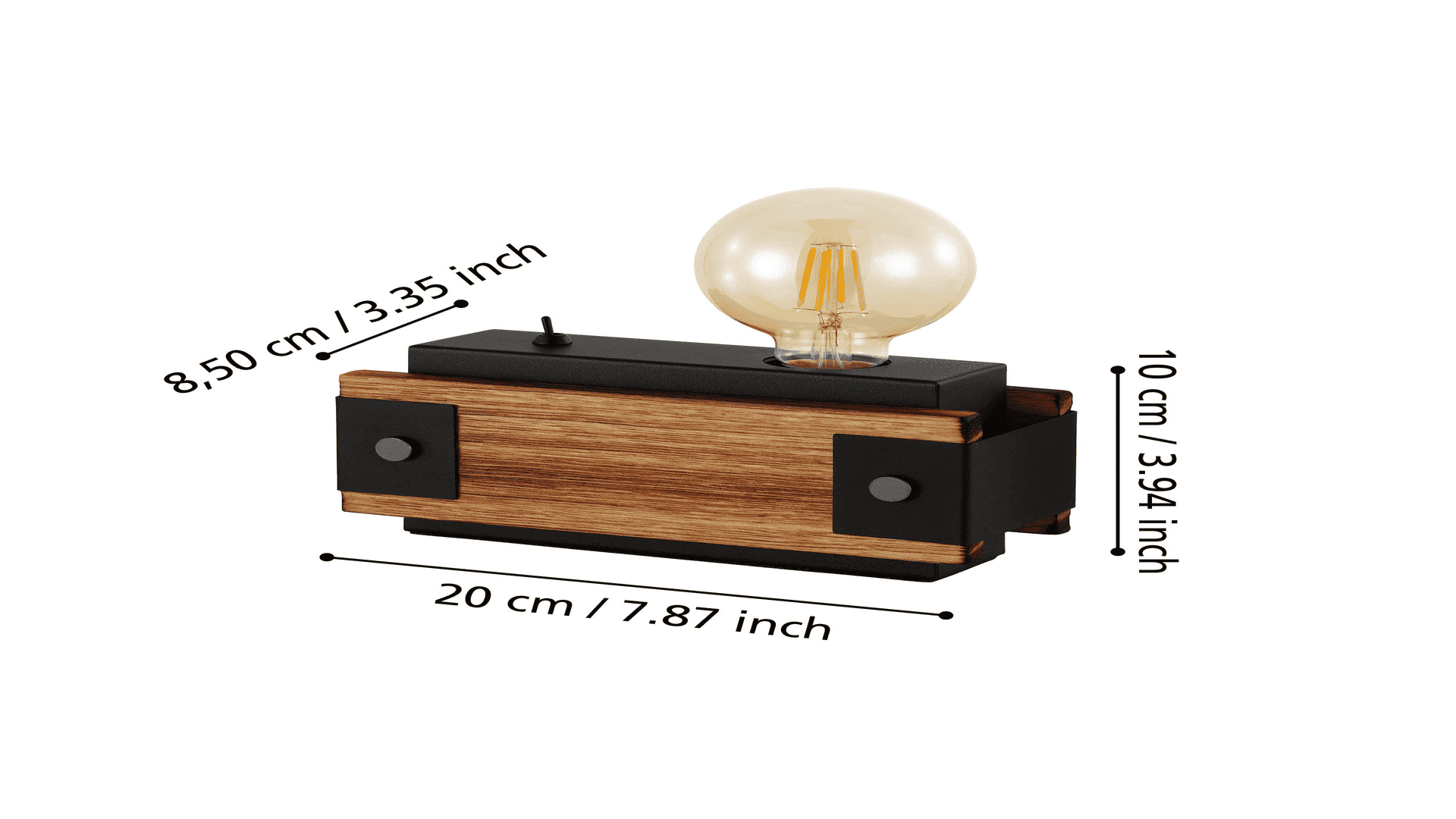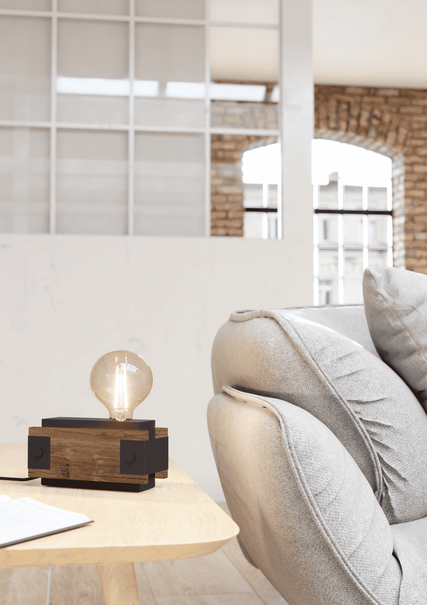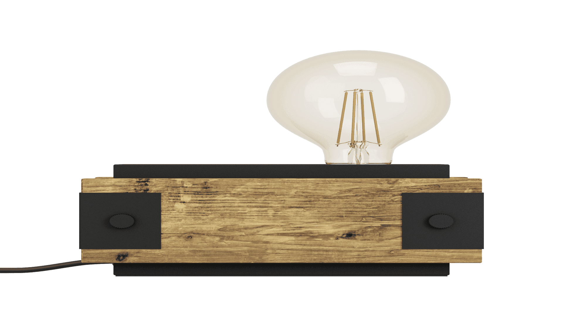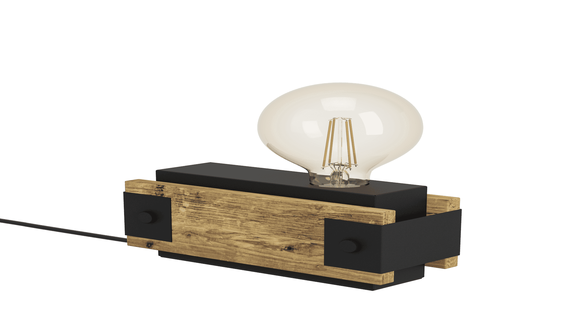 Die Tischleuchte LAYHAM ist aus schwarzem Metall mit seitlichen Blenden aus geflämmtem Holz und mit einer Fassung gefertigt. Ebenso ist ein bequemes Ein- und Ausschalten über einen Schalter am Kabel möglich. Die Tischlampe fügt sich nahtlos in die Trends wie Vintage und Industrial ein. Sie bietet einen besonderen Eye-Catcher für jeden Raum – egal ob im Schlafzimmer auf dem Nachttisch, im Wohnzimmer, Esszimmer oder im Flur auf dem Sideboard. Das abgebildete Filament-Leuchtmittel ist nicht im Lieferumfang enthalten. Geeignet ist die Leuchte für jedes Leuchtmittel mit E27-Sockel.