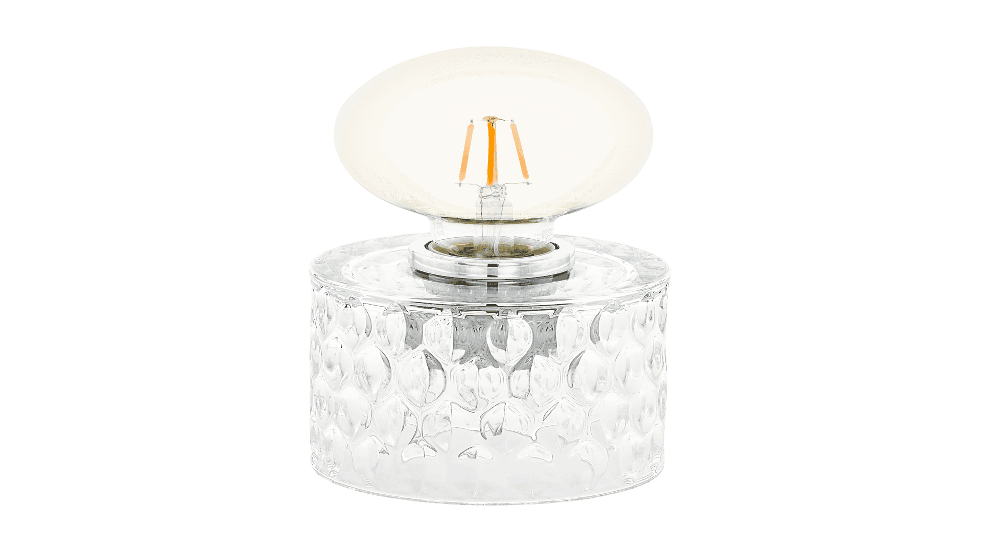Die Tischleuchte CERCAMAR ist aus einem transparenten Glassockel mit Relief-Muster gefertigt und wird mit einem sichtbaren Leuchtmittel kombiniert. Die Tischlampe fügt sich elegant in moderne Einrichtungen ein. Ebenso ist ein bequemes Ein- und Ausschalten über einen Schalter am Kabel möglich. Das schlichte, leicht verspielte Design sorgt für eine stilvolle Beleuchtung für jeden Raum – egal ob im Schlafzimmer auf dem Nachttisch, Wohnzimmer, Esszimmer oder Flur. Das abgebildete Filament-Leuchtmittel ist nicht im Lieferumfang enthalten. Geeignet ist die Leuchte für jedes Leuchtmittel mit E27-Sockel.