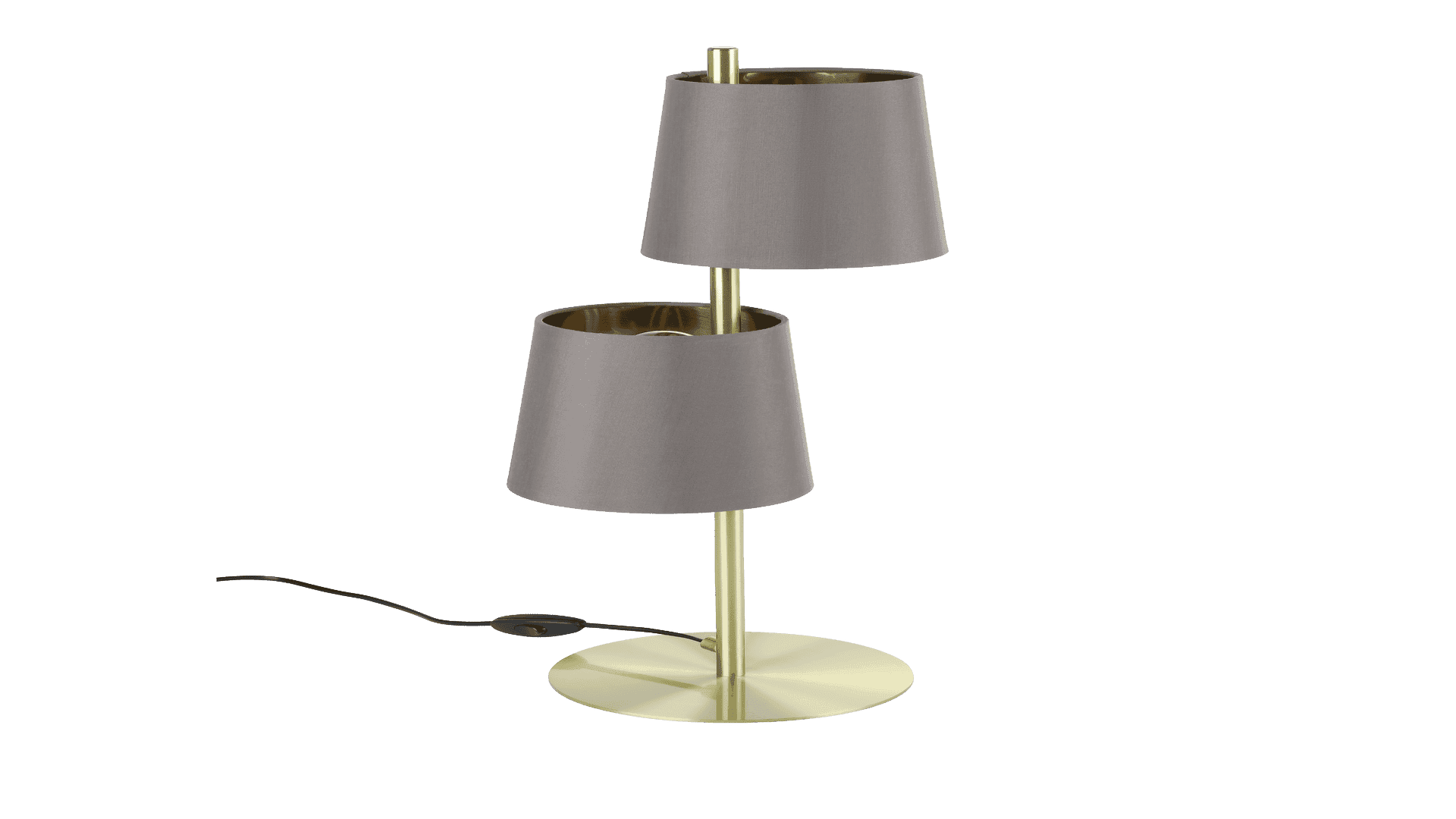 Die Tischleuchte ALMEIDA 2 besteht aus einem Metall-Fuß in Messing-Gebürstet, an dem zwei konische Textilschirme in Cappuccinofarben angebracht wurden. Die Kombination der Schirme mit der folierten Innenseite in Messing-Gebürstet sorgt für einen reizvollen und zugleich harmonischen Look. Ein bequemes Ein- und Ausschalten ist über einen Schalter am Kabel möglich. Die Tischlampe im 60er Jahre Retro-Chic fügt sich nahtlos in moderne Einrichtungssile ein und bietet eine wohnliche Beleuchtung im Schlafzimmer, Wohnzimmer, Esszimmer oder Flur. Die Leuchtmittel sind nicht im Lieferumfang enthalten. Geeignet ist die Leuchte für jedes Leuchtmittel mit E27-Sockel.