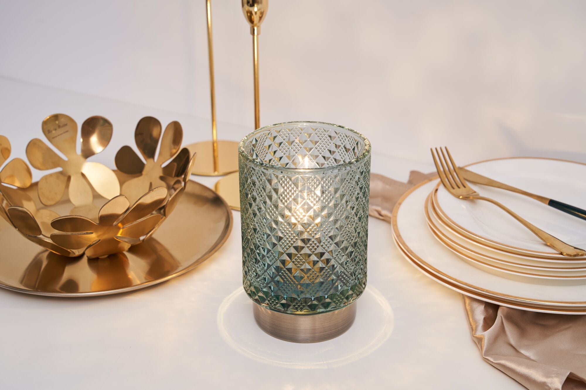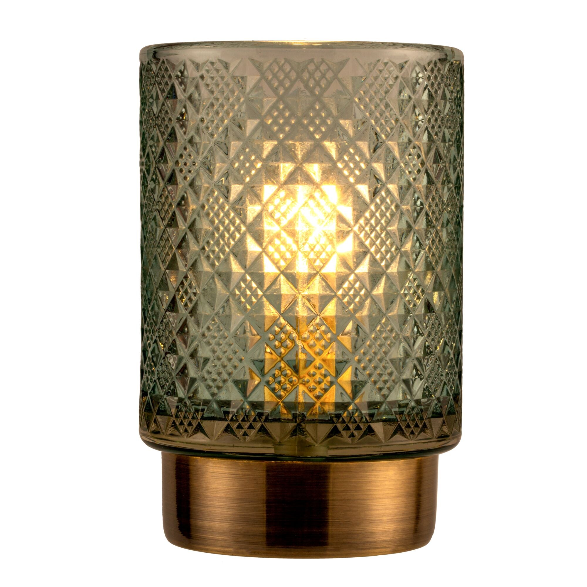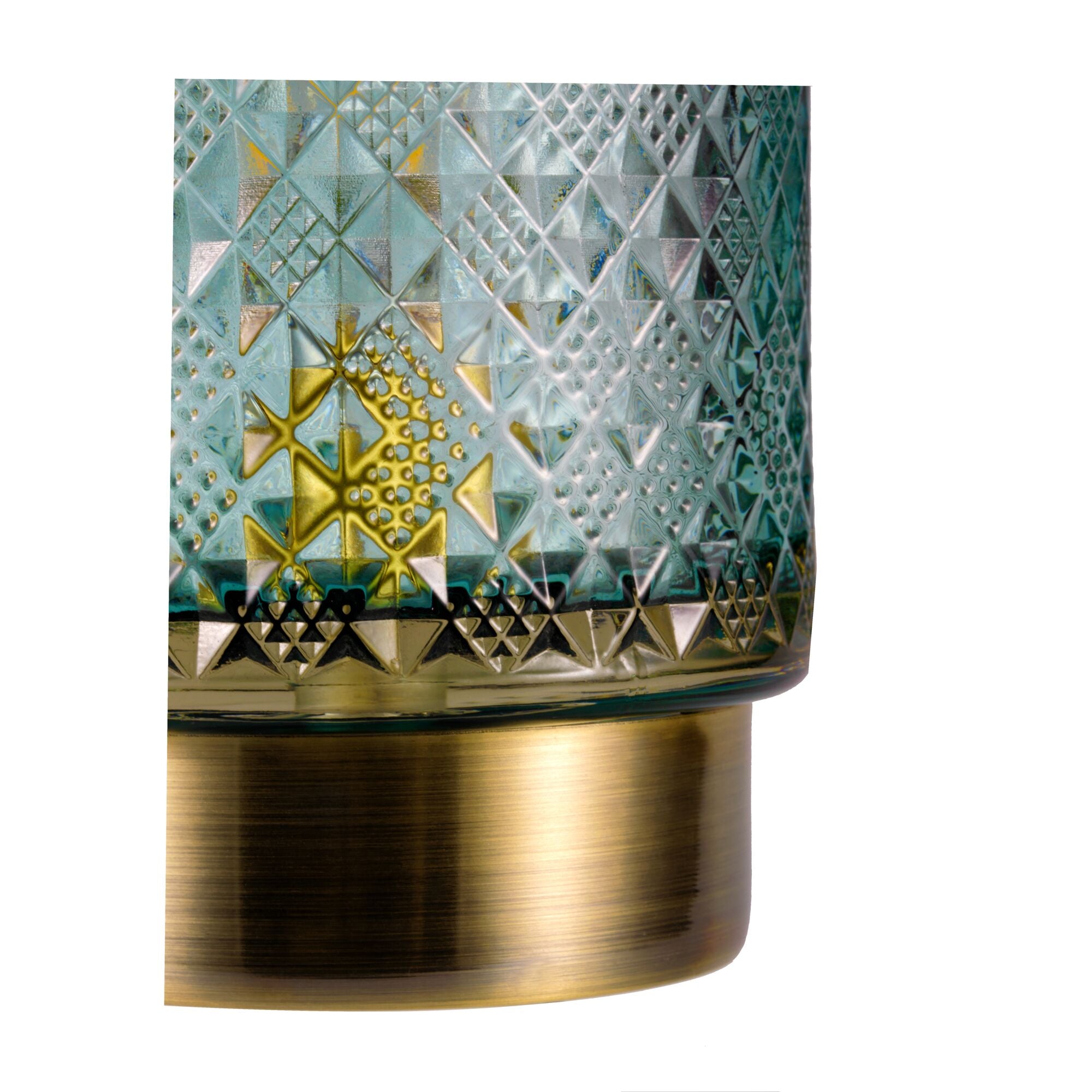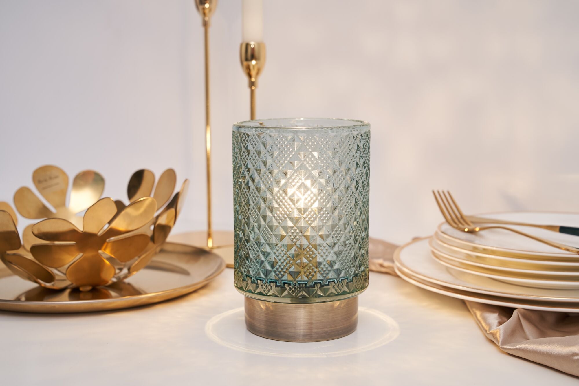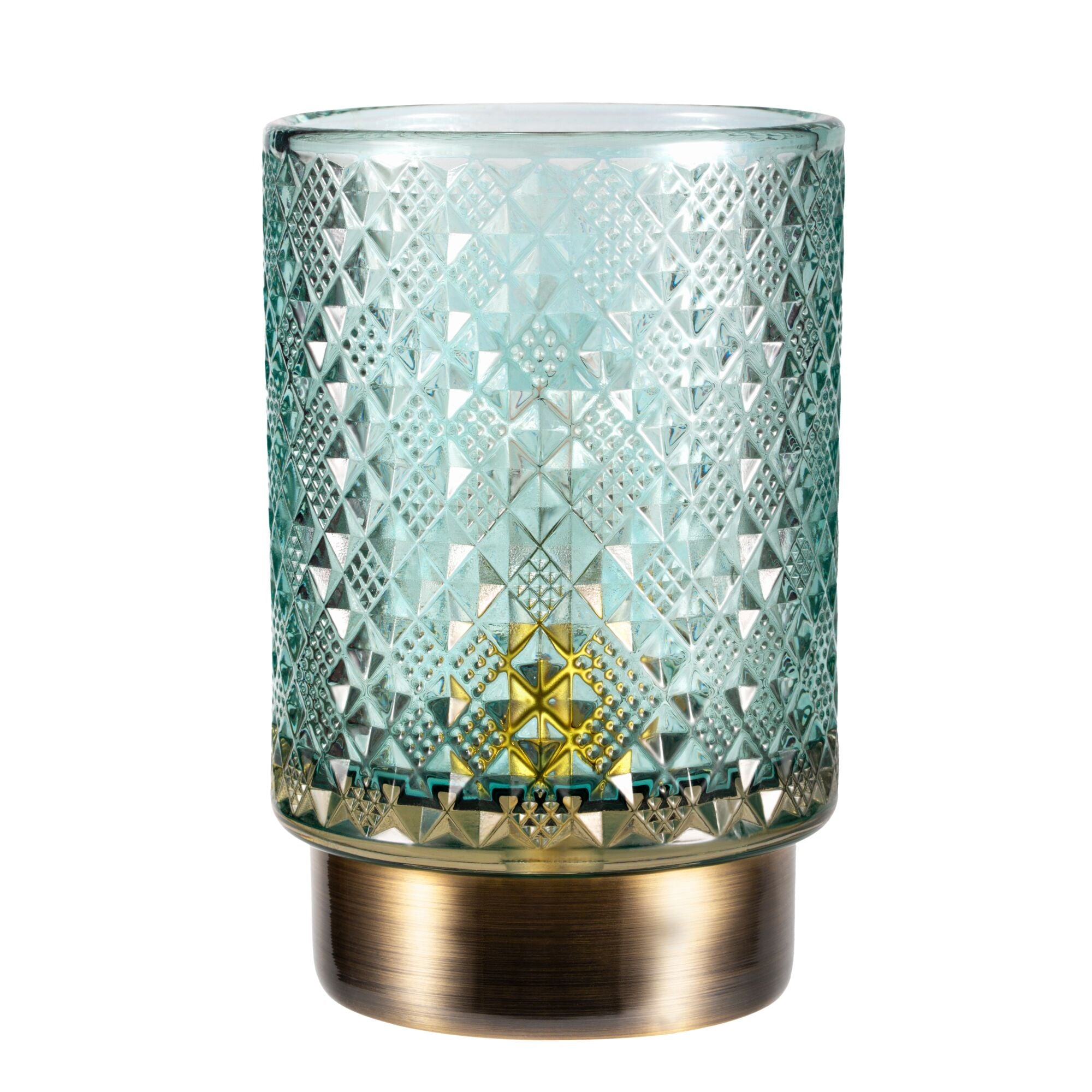 Die Tischleuchte Modern Glamour sorgt mit seinem schönen Glas in dezentem Türkis für faszinierende Licht-Akzente in Wohnzimmer oder Schlafzimmer. Die stilvolle Struktur des Glases und der messingfarbene Leuchtenfuß machen diese Tischlampe zu einem besonderen Deko-Highlight. Besonders edel wirkt sie beim abendlichen Dinner auf dem Esstisch, doch auch als Blickfang auf Regalen oder Kommoden zaubert sie eine gemütliche Lichtstimmung. Dank Batteriebetrieb kannst du die mobile Tischlampe überall und immer wieder neu platzieren - unabhängig davon, ob ein Stromanschluss in der Nähe ist. Durch den 6 Stunden Timer schaltet sich die Tischlampe automatisch wieder aus. Unser Tipp: Auf größeren Tischen, wie etwa dem Esstisch, wirken mehrere dieser Leuchten nebeneinander am schönsten. Hinweis: Bitte beachte, dass keine Batterien im Lieferumfang enthalten (3x AA).