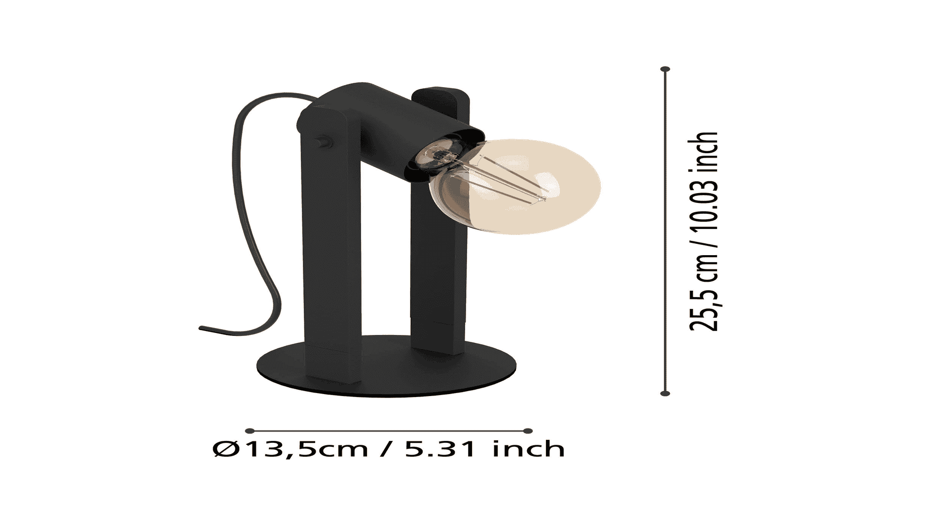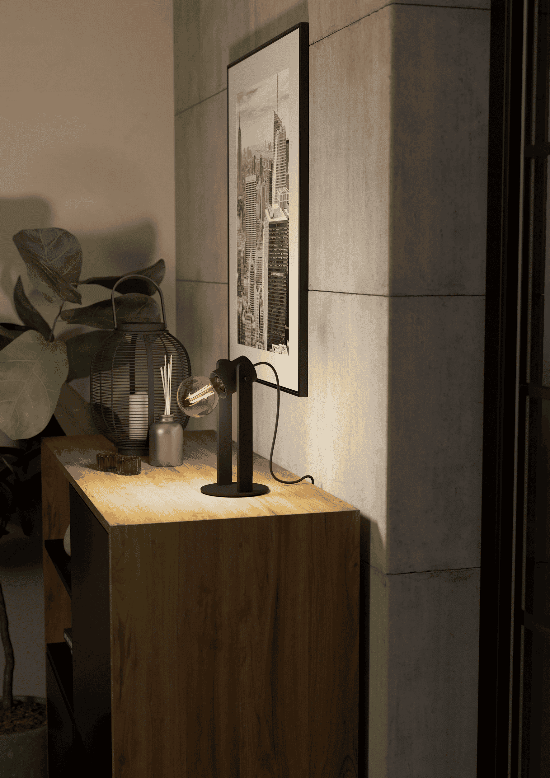 Die Tischleuchte PLIMSOLL ist aus einem schwarzen Holzgestell mit einer schwarzen, schwenkbaren Lampenfassung aus Metall gefertigt, die auf einem runden Metallfuß angebracht wurde. Ein bequemes Ein- und Ausschalten ist über einen Schalter am Kabel möglich. Mit ihrem spannenden Material-Mix aus Holz und Metall fügt sich die Tischlampe hervorragend in moderne Einrichtungsstile ein und bietet eine wohnliche Beleuchtung in der Küche, im Wohnzimmer, Esszimmer oder Flur. Das abgebildete Filament-Leuchtmittel ist nicht im Lieferumfang enthalten. Geeignet ist die Leuchte für jedes Leuchtmittel mit E27-Sockel.