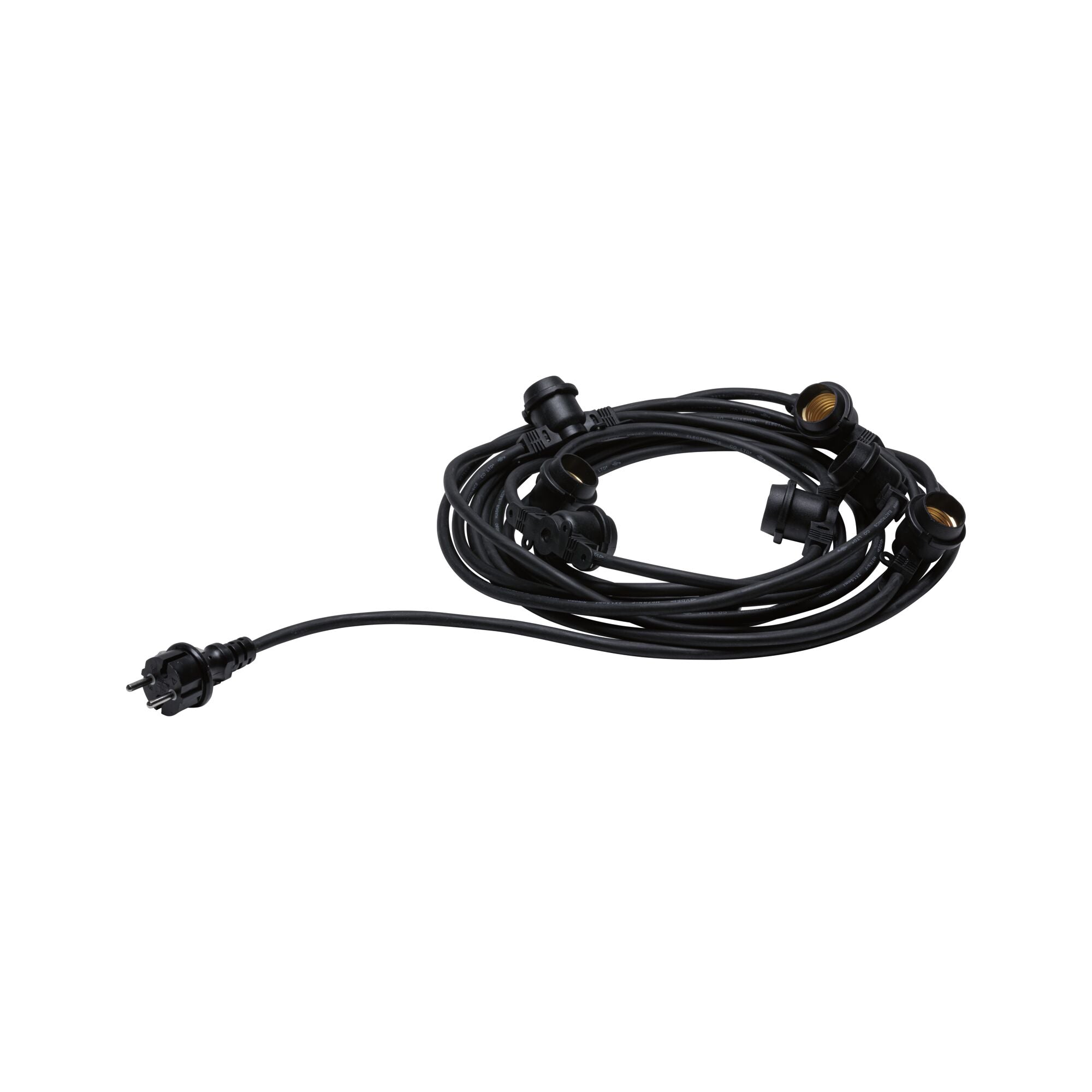 Die Außenlichterkette wird ohne Leuchtmittel geliefert und lässt sich toll mit farbigen Paulmann Filamentlampen kombinieren. Durch die E27-Fassungen lässt sie freie Wahl der Farbe und Form der Lampen und bietet so die Chance für einzigartige Kombinationen. Sie ist gegen Spritzwassergeschützt und bietet Platz für 7 Leuchtmittel mit E27-Sockel.