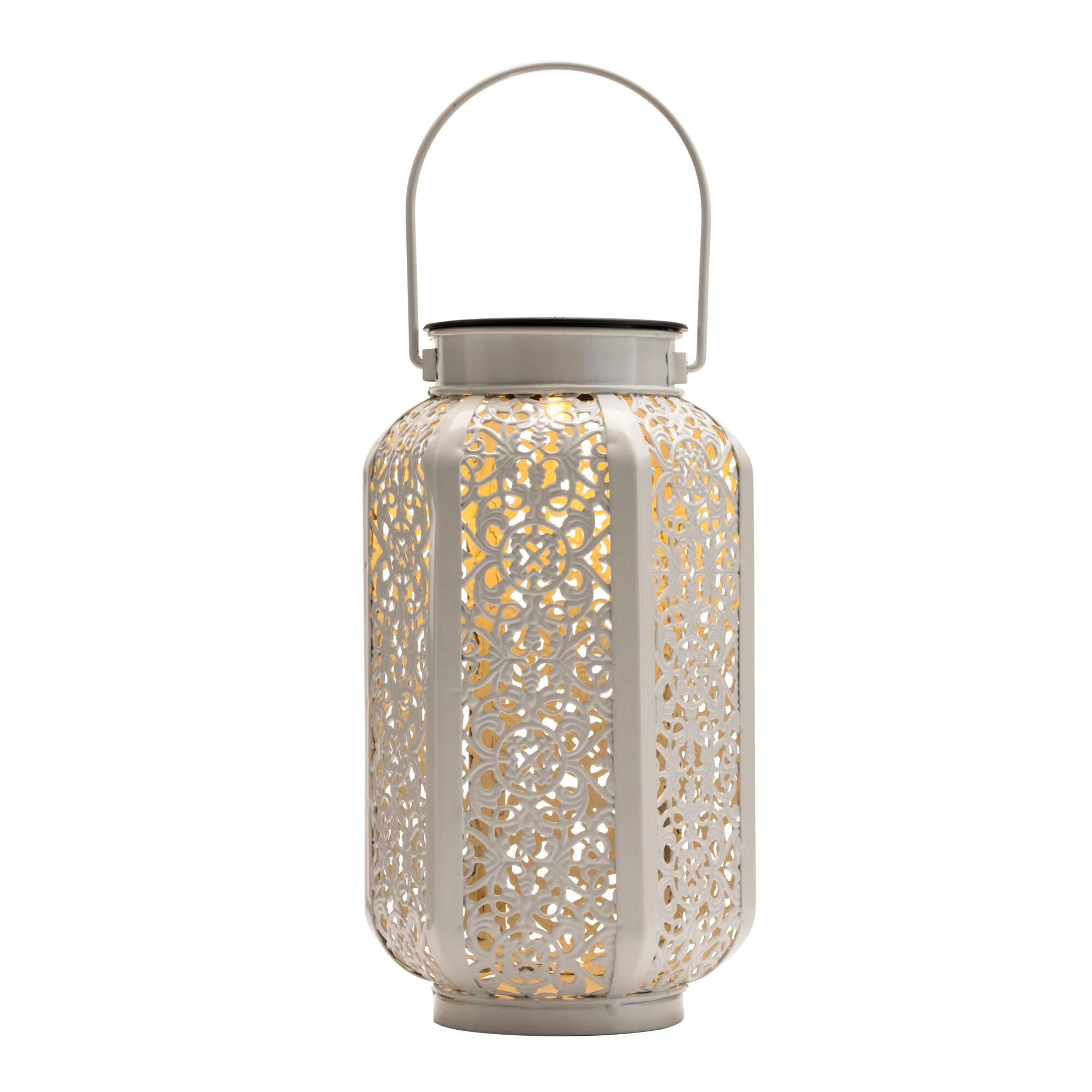 Die Solar-Laterne Sunshine Kiss mit ihrer weißen Vintage-Oberfläche zaubert romantische Lichteffekte in lange Sommernächte! Die Solar-Laterne lädt sich tagsüber im Sonnenlicht auf. Bei Dämmerung schaltet sich das Licht automatisch ein. Die Leuchtdauer beträgt bis zu 8 Stunden täglich. Das schafft eine gemütliche Atmosphäre auf dem Balkon oder im Garten. Die Solar-Laterne ist aus hochwertigem Metall hergestellt. Dank des Griffes lässt sich die Solarleuchte auch in Bäumen oder an Überdächern einfach aufhängen. Solar-Laternen haben viele Vorteile: Sie sind perfekt für Balkon oder Garten geeignet, sie benötigen keine Montage bzw. Kabel und haben einen austauschbaren Akku, dank IP-Schutz 44 sind sie spritzwassergeschützt, das heißt, dass sie auch wetterfest bei kleinen Regenschauern sind.